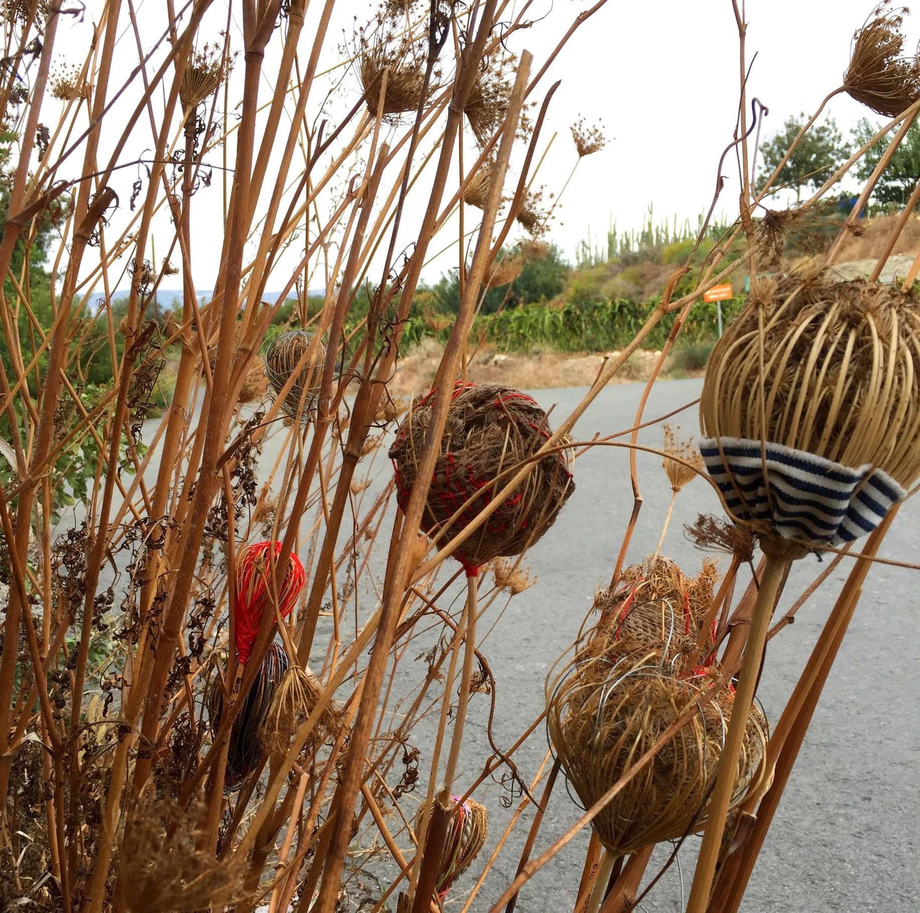 The seed heads were collected from a local field, taken back to the studio modified & adorned , then returned to the original field.