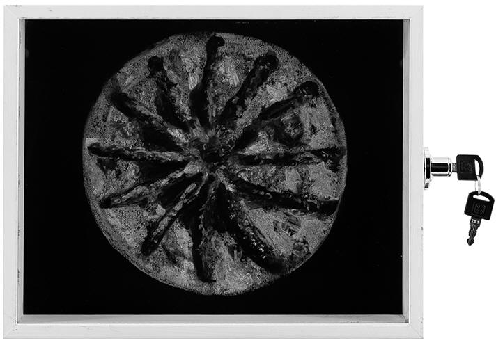 Seed Unit #3 'Black Poppy'' whit chalk on black board , MDF, glass.lock & key 27 x34 x 5 cm 2014
